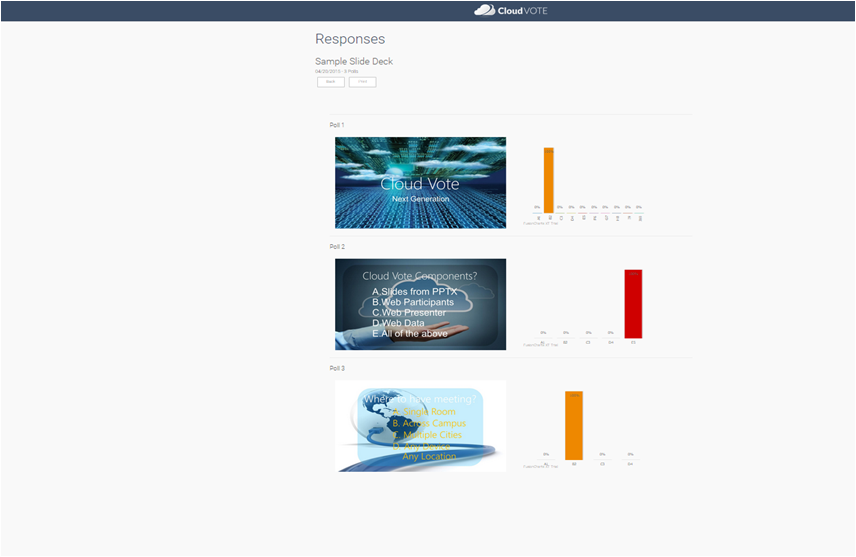 CloudVOTE is more then just a great voting and polling tool, It is an interactive presentation platform that allows content storage, management and participant reporting. If you are looking for a single location to distribute your PowerPoint presentations from in a secure format that limits presenter / trainer edits, CloudVote is the perfect solution.